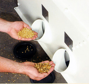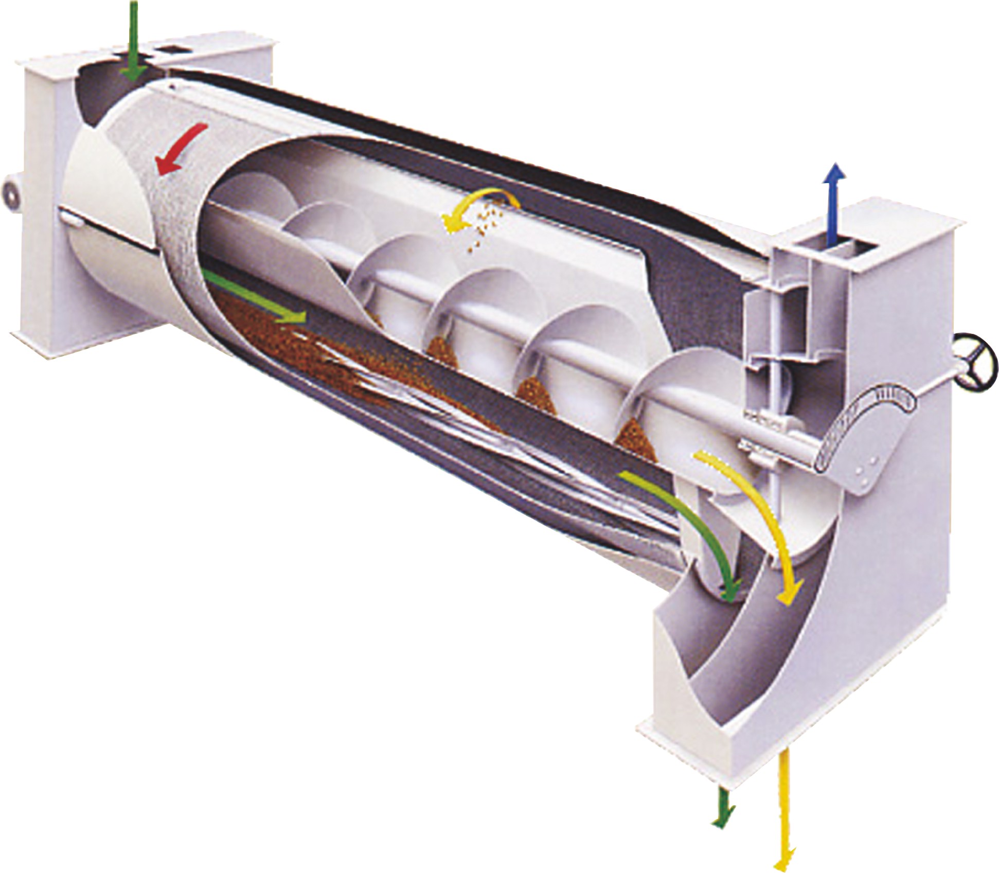 物料從主機(jī)架上部入口處進(jìn)入窩眼滾筒內(nèi),旋轉(zhuǎn)的窩眼滾筒上沖有尺寸精確的氣泡式窩眼,小于窩眼內(nèi)徑的顆粒會嵌入窩眼內(nèi),隨滾筒上行一定距離后落入中心U型料槽,而后被U型料槽內(nèi)的螺旋攪龍排出設(shè)備;而較長或較大的顆粒則因無法嵌入窩眼內(nèi)徑而滯留在滾筒里,最終經(jīng)由滾筒內(nèi)的另一端出口排出。因此,窩眼筒精選機(jī)不僅可以去雜質(zhì),也可以當(dāng)成更精準(zhǔn)的分級機(jī)使用。